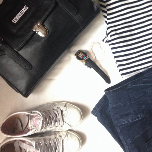 Ez a nap a sétálgatásról, a pihenésről, a kikapcsolódásról szól. Épp ezért lazára vettem a figurát: magas derekú, sötétkék színű farmert és egy csíkos, közép hosszú felsőt választottam. Az ehhez passzoló táska és karóra a kedvenceim közé tartoznak. Az órán nem látszik a felirat, ez áll rajta: “Everthing will be okey”.
